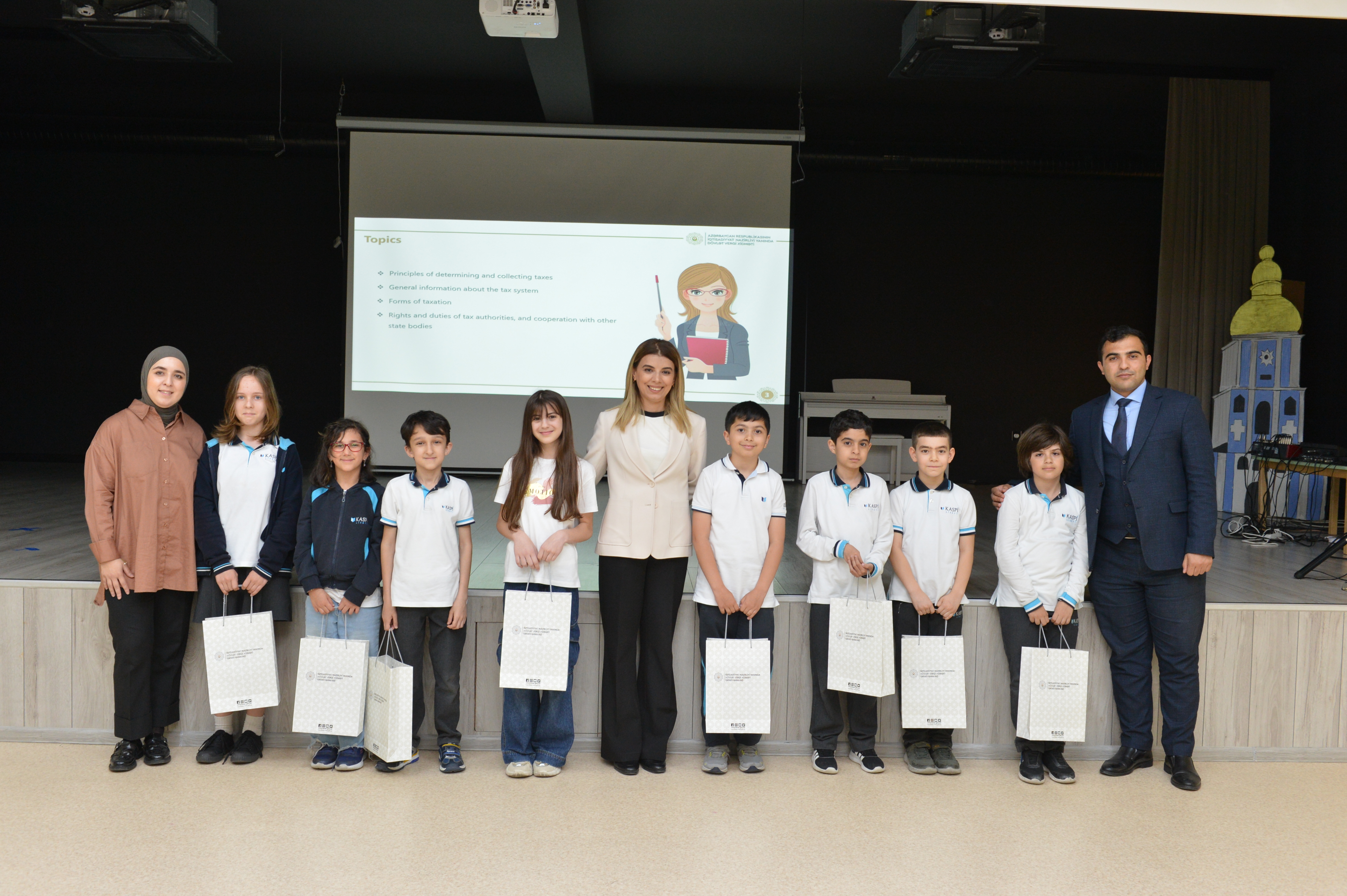 Sonda şagirdlər üçün vergi və maliyyə savadlığı üzrə maarifləndirici viktorina keçirilib, qaliblərə hədiyyələr təqdim edilib.
