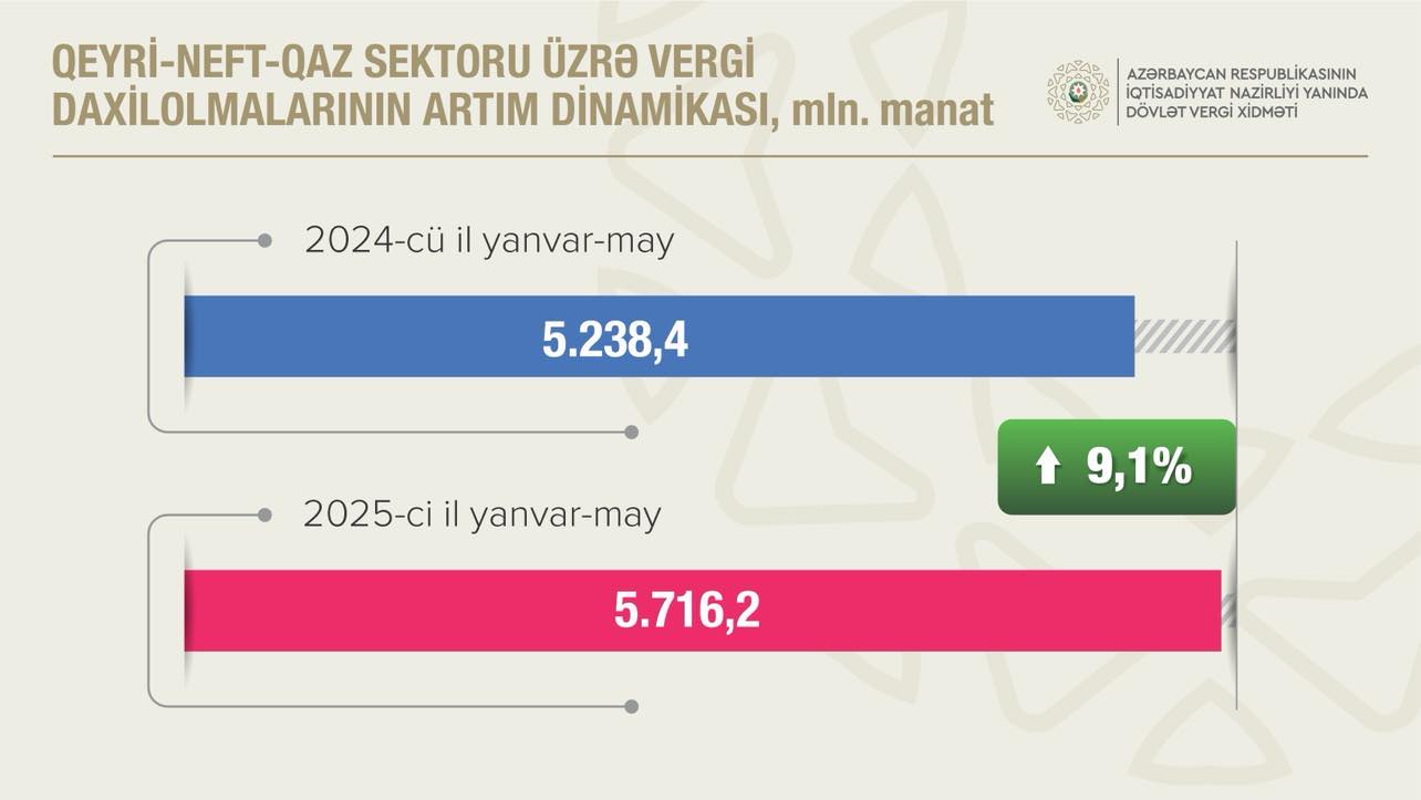 Qeyri-neft-qaz sektorundan daxilolmalar 5 milyard 716,2 milyon manata yaxın təşkil edib. 2024-cü ilin eyni dövrü ilə müqayisədə bu sektordan vergi daxilolmaları 9,1 faiz çox olub.