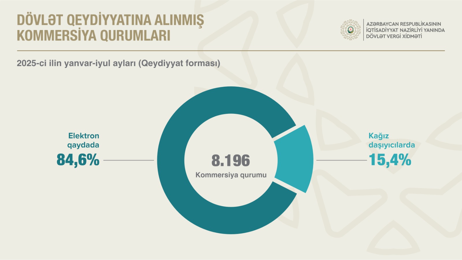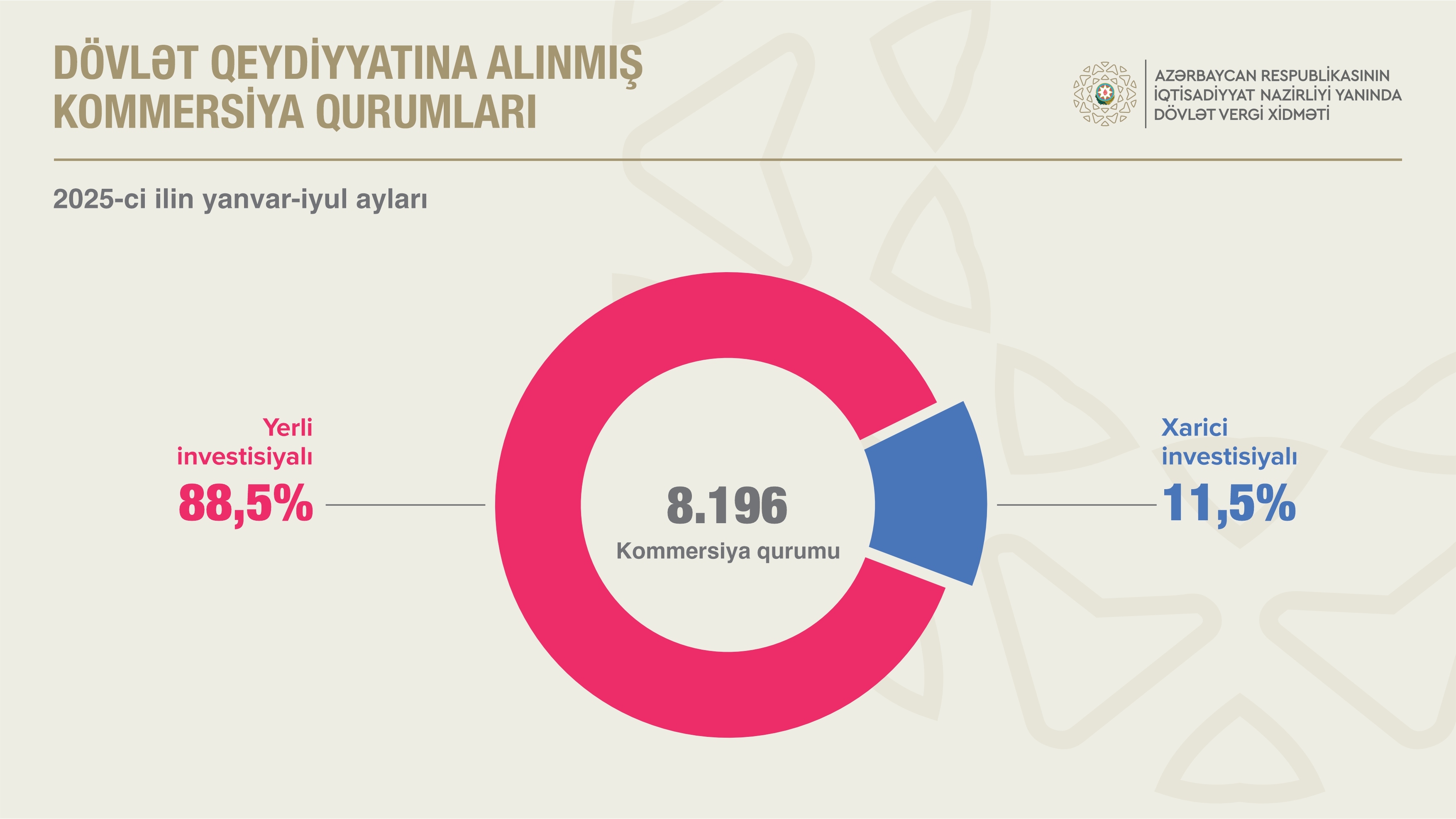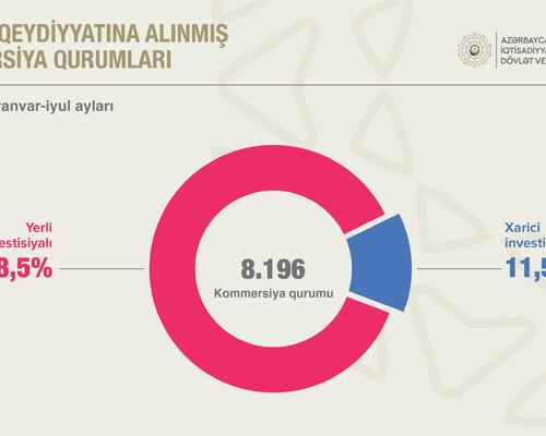 Avqust ayının 1-nə qeydiyyatda olan kommersiya qurumlarının sayı ötən ilin müvafiq dövrü ilə müqayisədə 8,1 faiz artaraq 198.371 vahid təşkil edib. 2025-ci ilin yanvar – iyul aylarında 8.196 kommersiya qurumu dövlət qeydiyyatından keçib ki, bunun da 88,5 faizi yerli investisiyalı, 11,5 faizi isə xarici investisiyalıdır. Dövlət qeydiyyatında olan kommersiya hüquqi şəxslərin 91,8 faizi məhdud məsuliyyətli cəmiyyət, 1,1 faizi səhmdar cəmiyyət, 1,1 faizi kooperativ və s. formalarda yaradılıb.