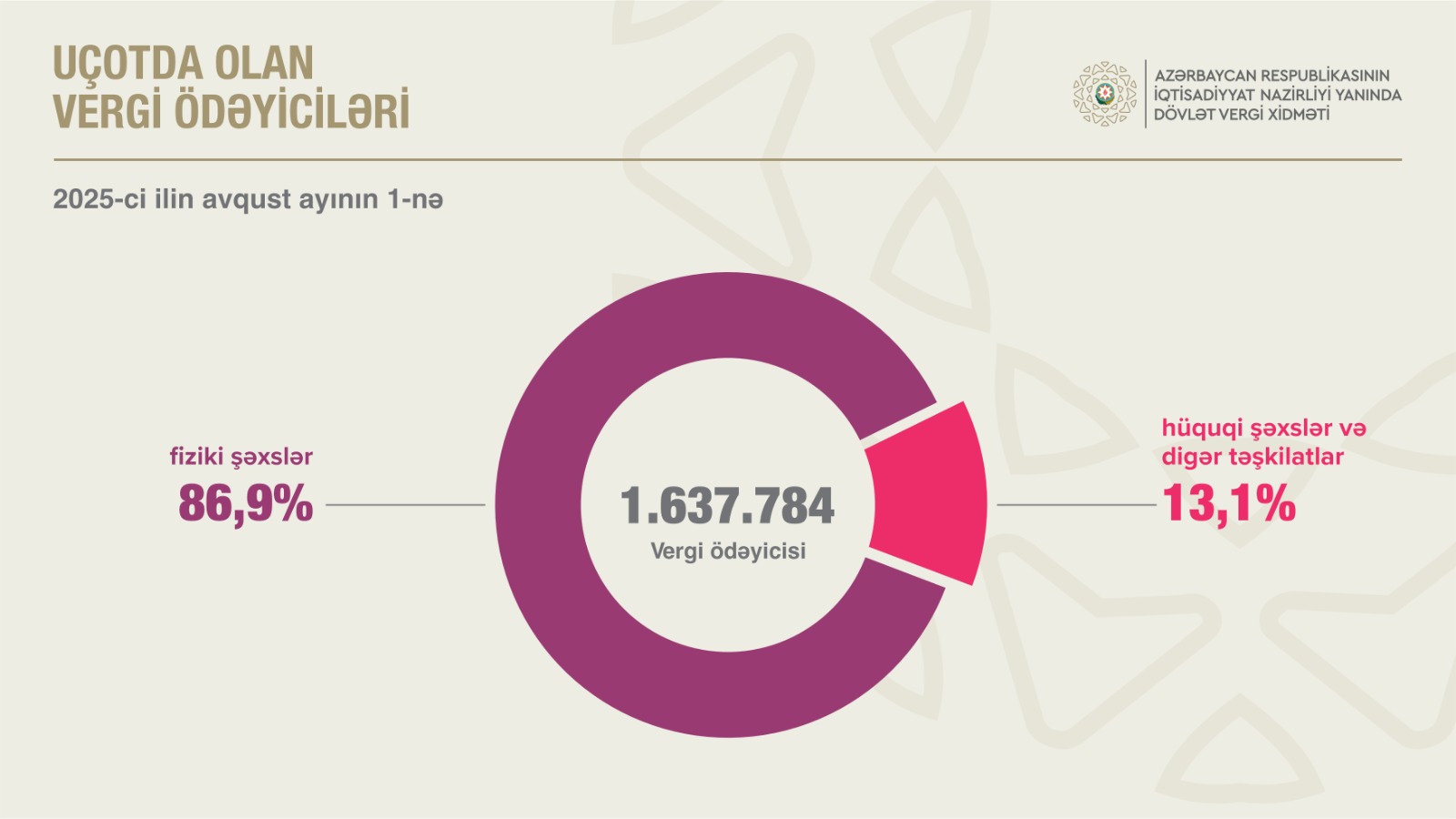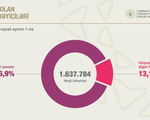 2025-ci ilin avqust ayının 1-nə respublika üzrə uçotda olan 1.637.784 vergi ödəyicisinin 86,9 faizi fiziki şəxslər, 13,1 faizi hüquqi şəxslər və digər təşkilatlar olub. Ötən ilin müvafiq dövrü ilə müqayisədə vergi ödəyicilərinin ümumi sayı 4,8 faiz, o cümlədən fiziki şəxslərin sayı 4,4 faiz, hüquqi şəxslərin sayı isə 7,4 faiz artıb.