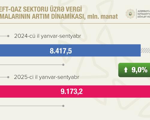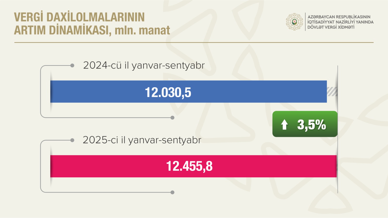 2025-ci ilin yanvar - sentyabr aylarında İqtisadiyyat Nazirliyi yanında Dövlət Vergi Xidmətinin xəttilə dövlət büdcəsinə 12 milyard 455,8 milyon manat vergi daxil olub, proqnoza 105,2 faiz əməl edilib. 2024-cü ilin müvafiq dövrü ilə müqayisədə dövlət büdcəsinə vergi daxilolmaları 425,3 milyon manat və ya 3,5 faiz artıb.