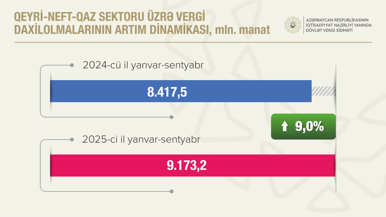 Qeyri-neft-qaz sektorundan daxilolmalar 9 milyard 173,2 milyon manat olub, proqnoz 103,0 faiz icra edilib. Əvvəlki ilin müvafiq dövrü ilə müqayisədə bu sektordan vergi daxilolmaları 755,7 milyon manat və ya 9,0 faiz artıb. Ödənilən vergilərin 73,6 faizi qeyri-neft-qaz sektorunun, 26,4 faizi isə neft-qaz sektorunun payına düşüb.