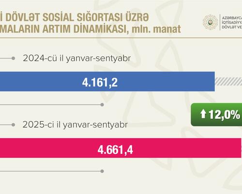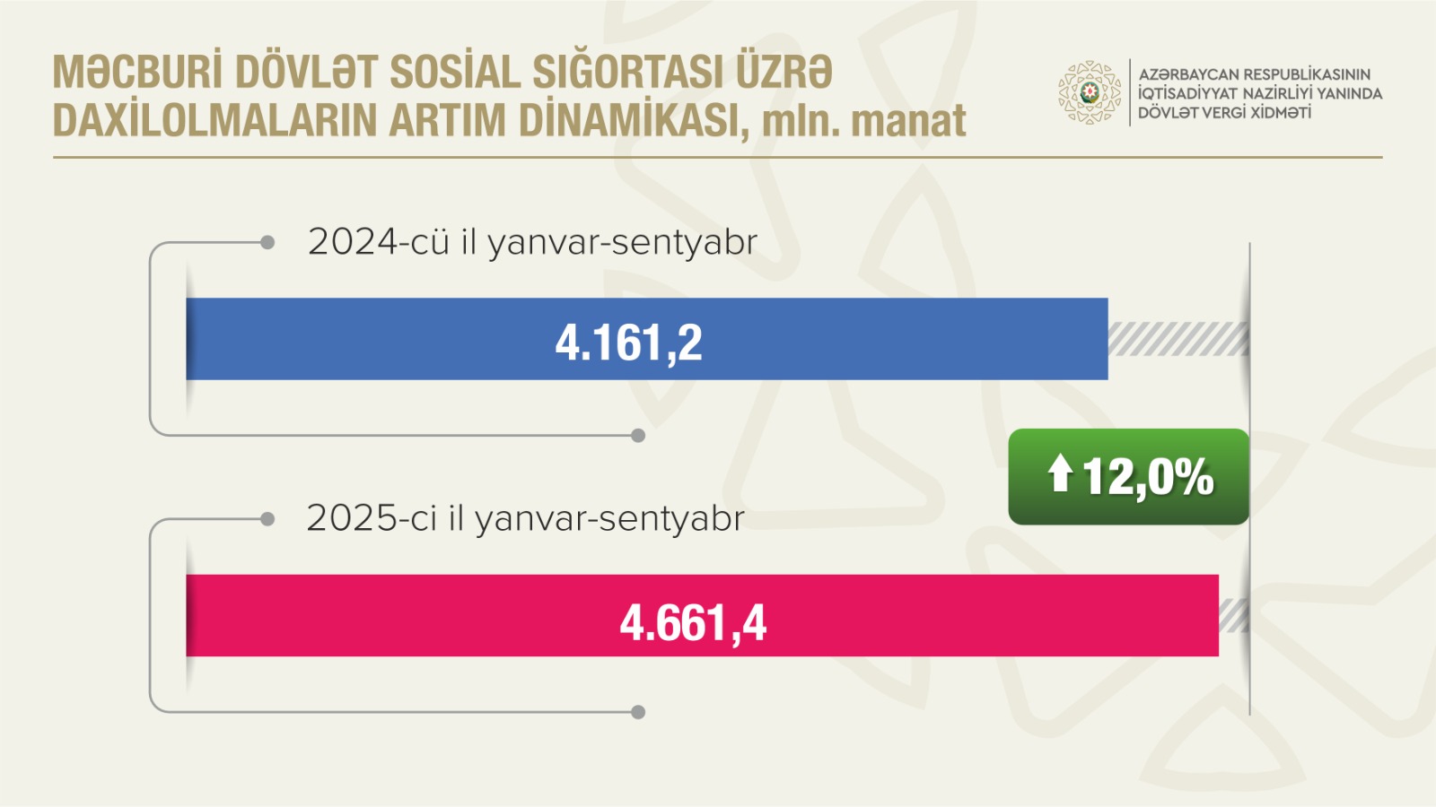 2025-ci ilin yanvar – sentyabr aylarında muzdlu işçi sayının və əməkhaqqı fondunun “ağarması” prosesi şəraitində məcburi dövlət sosial sığorta haqları üzrə daxilolmalar 4 milyard 661,4 milyon manat təşkil edib. Bu mənbədən daxilolmalar əvvəlki ilin müvafiq dövrü ilə müqayisədə 12,0 faiz və ya 500,1 milyon manatdan çox artıb. Qeyri-büdcə təşkilatları üzrə daxilolmalar ötən ilin eyni dövrü ilə müqayisədə 13,0 faiz artaraq 3 milyard 113,2 milyon manat olub.