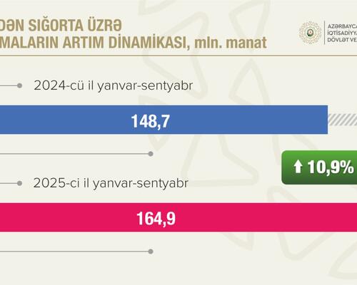 İşsizlikdən sığorta haqları üzrə daxilolmalar 2024-cü ilin eyni dövrü ilə müqayisədə 10,9 faiz artıb və 164,9 milyon manat təşkil edib. Qeyri-büdcə təşkilatları üzrə daxilolmalar 12,2 faiz artaraq 126,1 milyon manat olub.