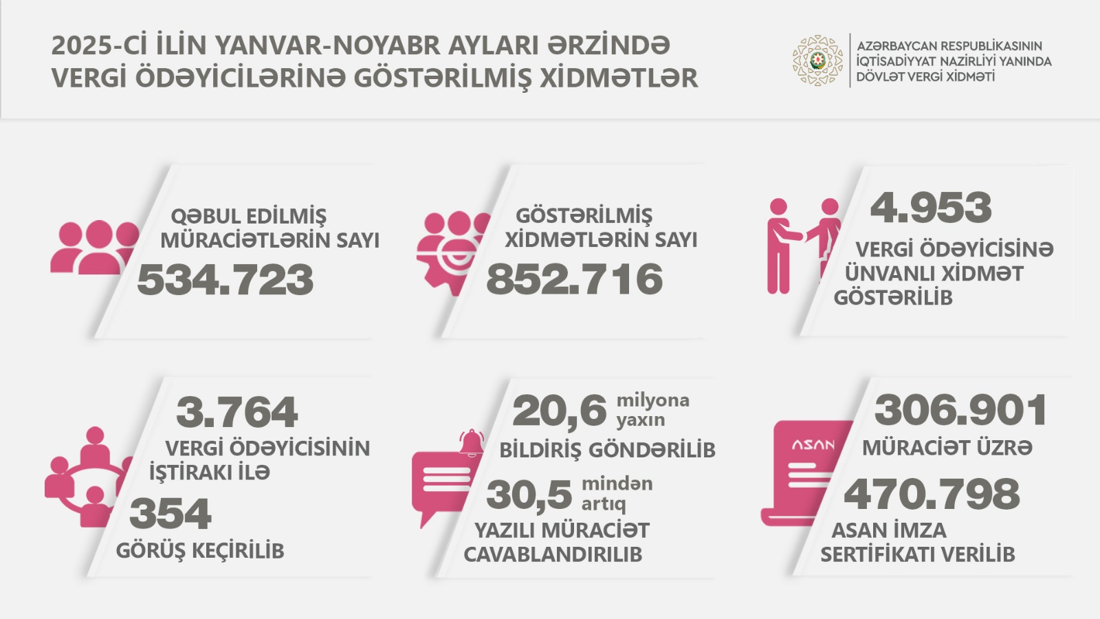 2025-ci ilin yanvar – noyabr ayları ərzində vergi ödəyicilərinə xidmət mərkəzlərində ümumilikdə 534.723 müraciət qəbul edilib. Həmin müraciətlər üzrə 852.716 sayda xidmət göstərilib ki, bunun da 301 mindən çoxu şifahi (müraciət etmiş şəxslərin vergi qanunvericiliyi və inzibatçılığı ilə əlaqədar suallarının cavablandırılması), 188 mindən çoxu elektron (bəyannamələrin və hesabatların, habelə müxtəlif ərizələrin tərtibatına və elektron formada göndərilməsinə köməklik göstərilməsi) xidmətlər olub.