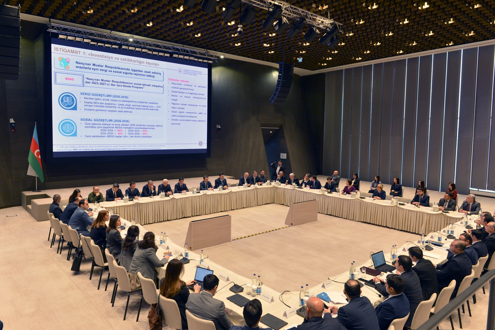 Daha sonra tədbir iştirakçıları üçün geniş təqdimat edilib. Baş idarə rəisinin müavini Əvəz Quliyev bildirib ki, 2026-cı ildə Naxçıvan Muxtar Respublikasına işğaldan azad edilmiş ərazilərlə eyni vergi rejiminin tətbiqi, fərdi sahibkarların sosial sığorta yükünün dövriyyəyə uyğun tənzimlənməsi, yerli avtomobil istehsalı, gəmiqayırma və kənd təsərrüfatı kimi prioritet sektorlara güzəştlərin verilməsi nəzərdə tutulur.