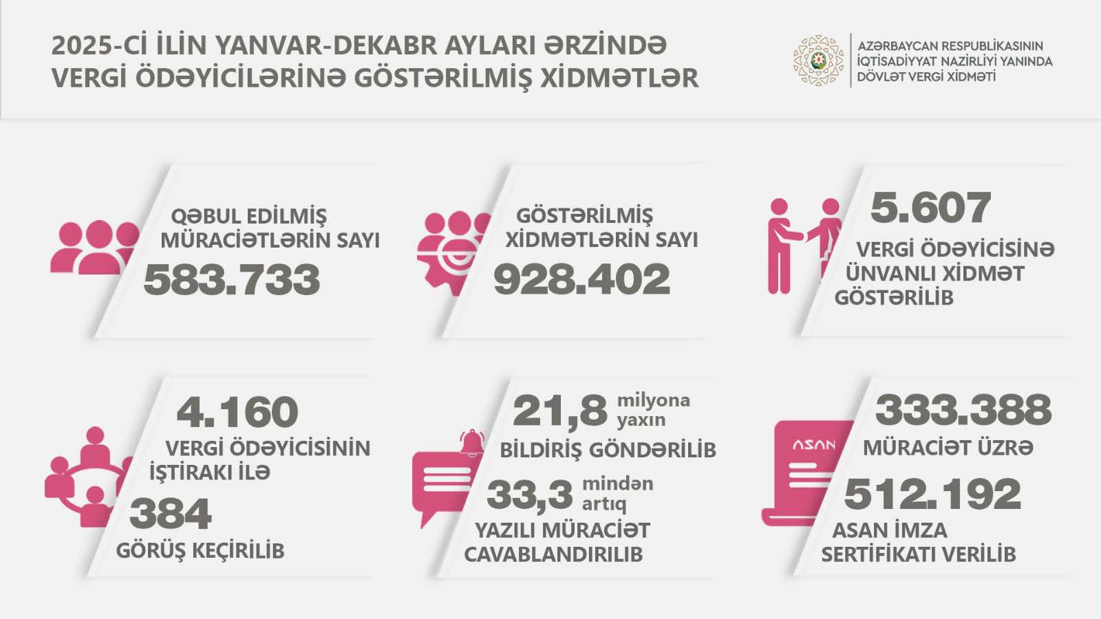 2025-ci il ərzində vergi ödəyicilərinə xidmət mərkəzlərində ümumilikdə 583.733 müraciət qəbul edilib. Həmin müraciətlər üzrə 928.402 sayda xidmət göstərilib ki, bunun da 331 mindən çoxu şifahi (müraciət etmiş şəxslərin vergi qanunvericiliyi və inzibatçılığı ilə əlaqədar suallarının cavablandırılması), 199 mindən çoxu elektron (bəyannamələrin və hesabatların, habelə müxtəlif ərizələrin tərtibatına və elektron formada göndərilməsinə köməklik göstərilməsi) xidmətlər olub.