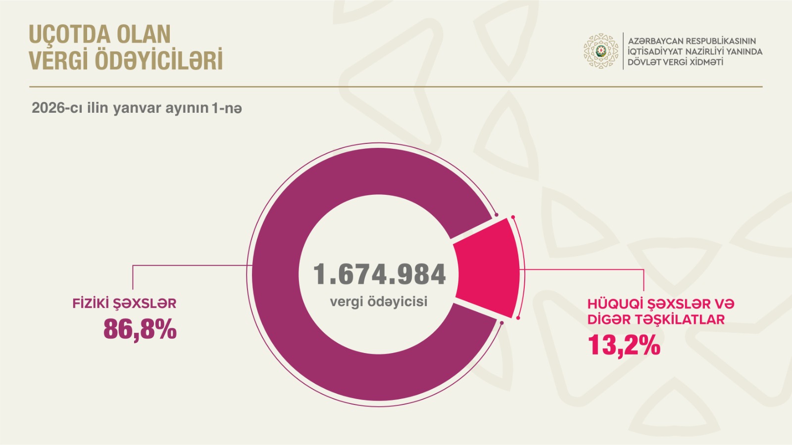 2026-cı ilin yanvar ayının 1-nə respublika üzrə uçotda olan 1.674.984 vergi ödəyicisinin 86,8 faizi fiziki şəxslər, 13,2 faizi hüquqi şəxslər və digər təşkilatlar olub. 2025-ci ilin əvvəli ilə müqayisədə vergi ödəyicilərinin ümumi sayı 4,9 faiz, o cümlədən fiziki şəxslərin sayı 4,6 faiz, hüquqi şəxslərin sayı 6,6 faiz artıb.