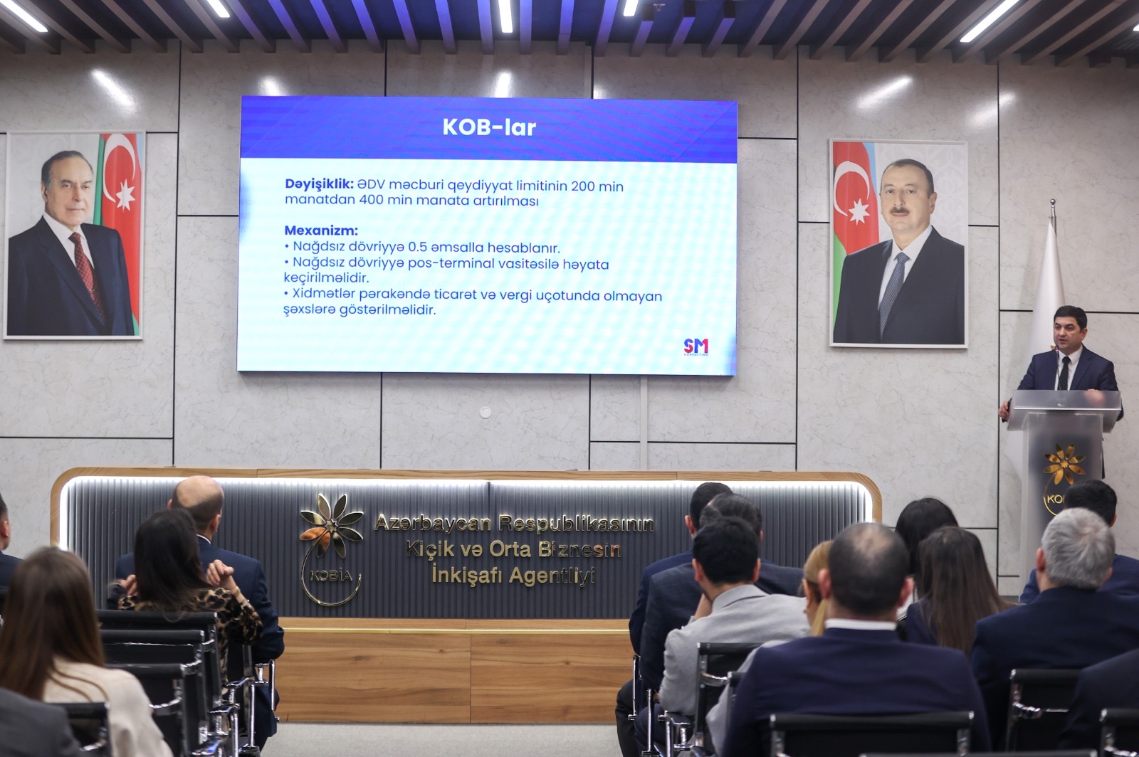 “Bakı KOB evi”ndə Dövlət Vergi Xidməti (DVX), Kiçik və Orta Biznesin İnkişafı Agentliyi (KOBİA), “SM Consulting” və “Gbaru.com”un birgə təşkilatçılığı ilə Vergi Məcəlləsində edilmiş son dəyişikliklərlə bağlı sahibkarların məlumatlandırılması məqsədilə seminar təşkil olunub. Tədbirdə iqtisadiyyatın müxtəlif sektorlarında fəaliyyət göstərən 50-dək sahibkar iştirak edib.