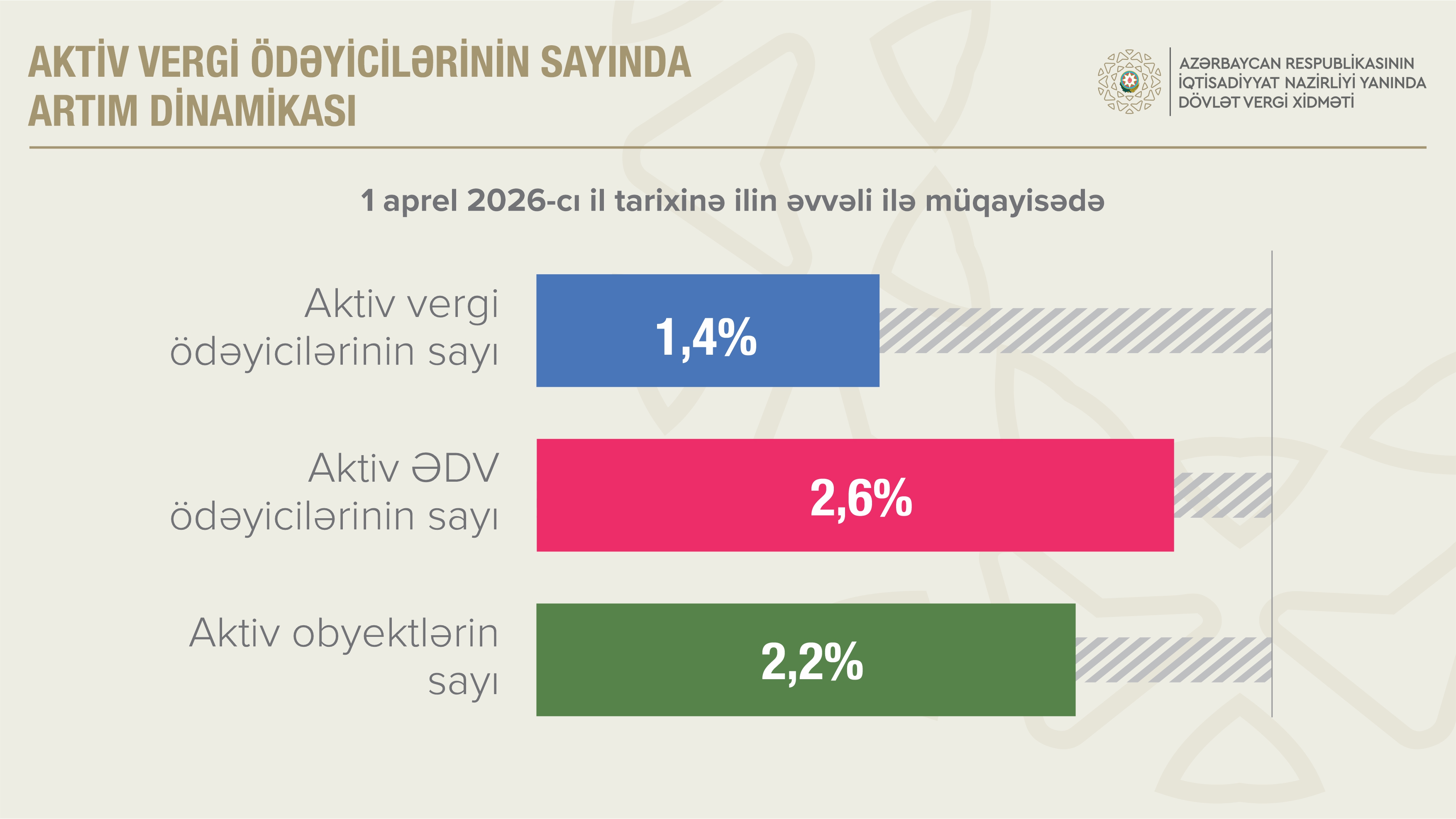 1 aprel 2026-cı il tarixinə aktiv vergi ödəyicilərinin sayı ilin əvvəli ilə müqayisədə 1,4 faiz artaraq 871.138, aktiv ƏDV ödəyicilərinin sayı isə 2,6 faiz artaraq 59.942 təşkil edib. Həmin tarixə aktiv təsərrüfat subyektlərinin (obyektlərinin) sayı 2,2 faiz artıb və 237.896 olub.