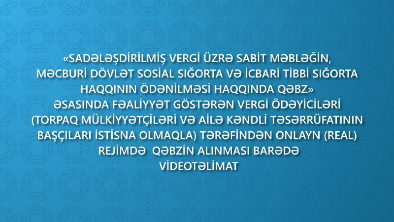 İqtisadiyyat Nazirliyi yanında Dövlət Vergi Xidməti tərəfindən vergi ödəyicilərinə dəstək məqsədilə “Sadələşdirilmiş vergi üzrə sabit məbləğin, məcburi dövlət sosial sığorta və icbari tibbi sığorta haqqının ödənilməsi haqqında qəbz” əsasında fəaliyyət göstərən ödəyicilər (torpaq mülkiyyətçiləri və ailə kəndli təsərrüfatının başçıları istisna olmaqla) tərəfindən onlayn (real) rejimdə qəbzin alınması ilə bağlı videotəlimat hazırlanıb.