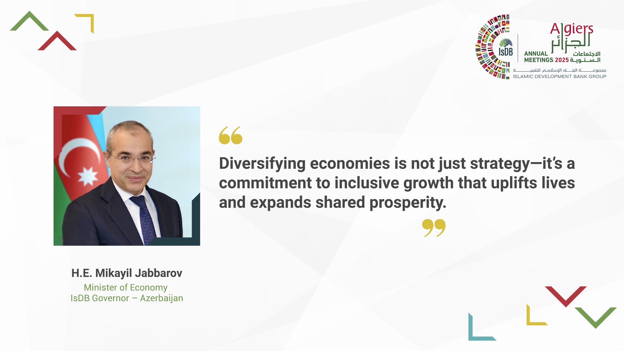 “İslam İnkişaf Bankı (İİB) Qrupu ilə əməkdaşlığın genişləndirilməsi xüsusi önəm kəsb edir. İİB Qrupunun Əlcəzairdə keçirilən İllik Toplantısında ölkəmizi təmsil etməkdən məmnunluq duyuruq”.
