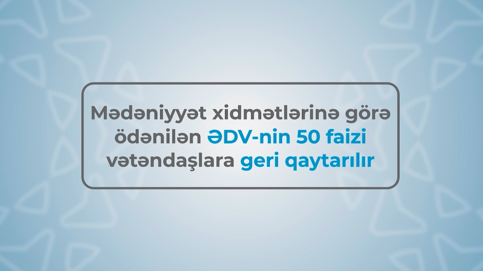 İqtisadiyyat Nazirliyi yanında Dövlət Vergi Xidməti tərəfindən “ƏDV geri al” layihəsi çərçivəsində mədəniyyət xidmətlərindən istifadə zamanı ƏDV-nin 50 faizinin geri qaytarılması barədə maarifləndirici videoçarx hazırlanıb. Çarxda teatr tamaşaları, film nümayişi, muzey ziyarəti və simfonik orkestrin konserti kimi xidmətlərdən istifadəyə görə ödənilmiş ƏDV-nin bir hissəsinin vətəndaşlara geri qaytarılması ilə bağlı məlumat verilir.
